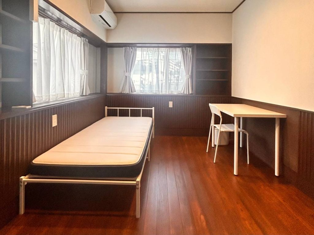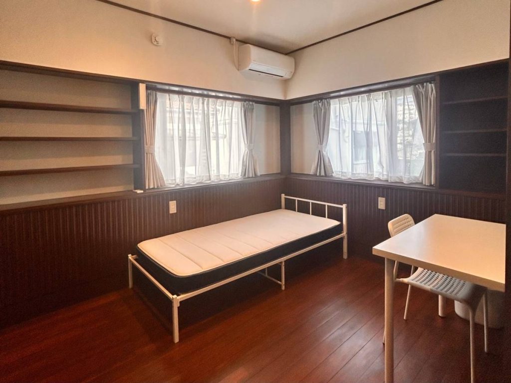 ベッド、机、イス、エアコン、カーテン、