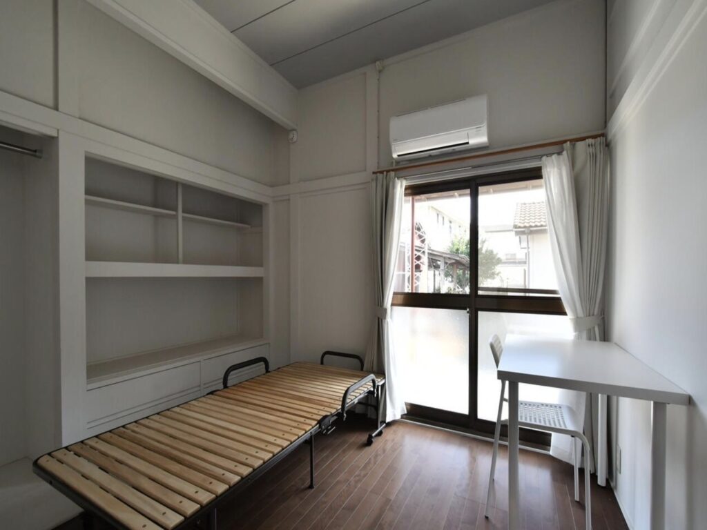 ベッド、机、イス、エアコン、二重カーテン、